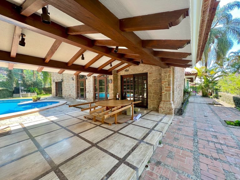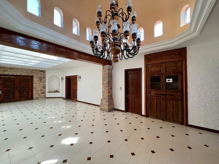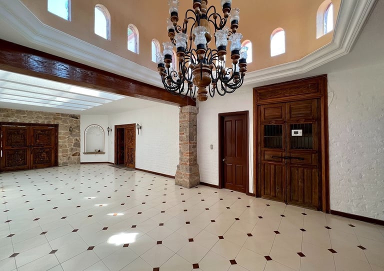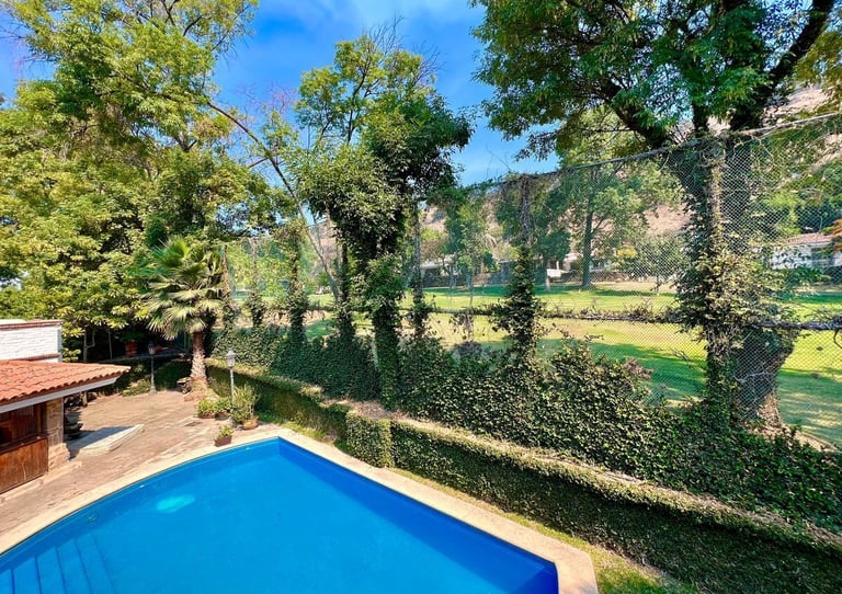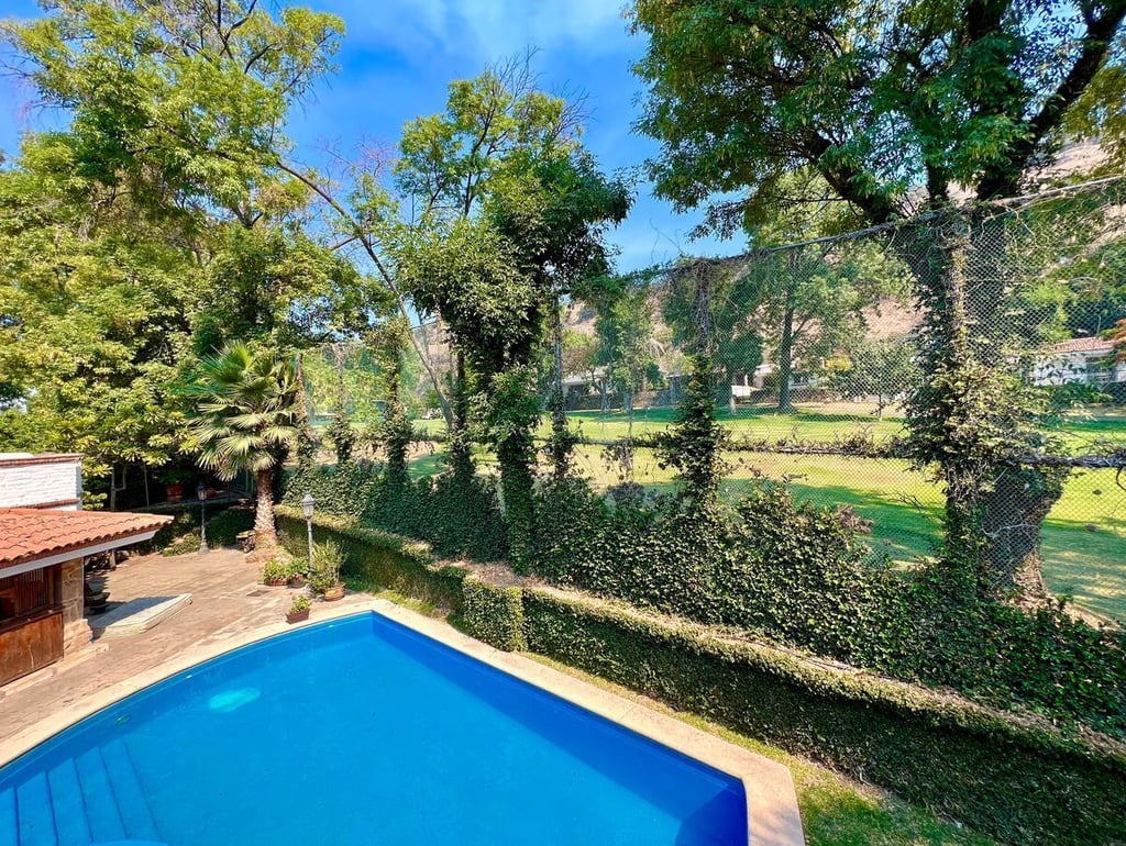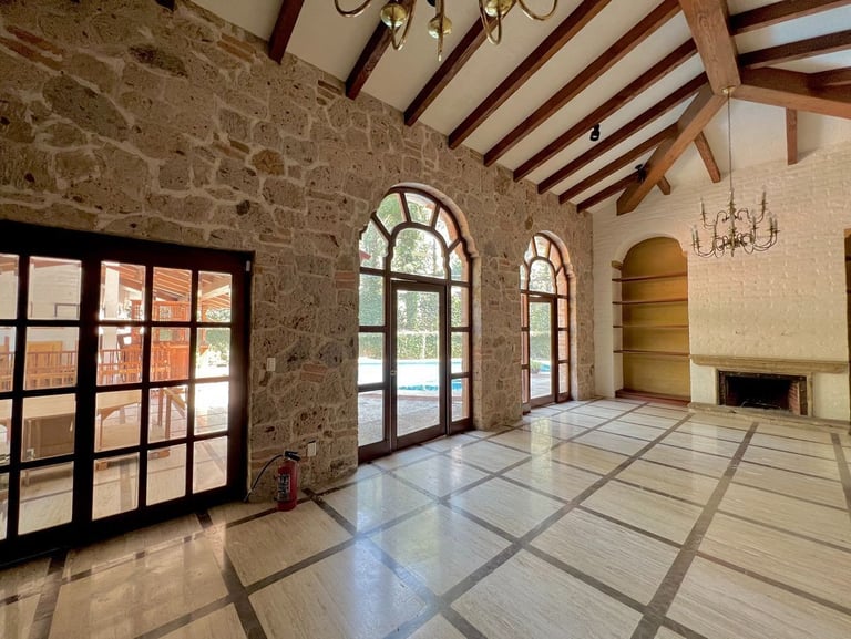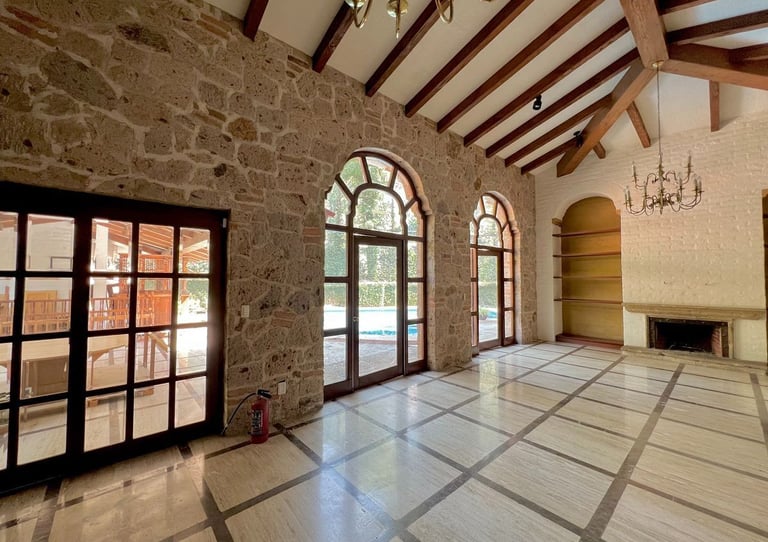 • Salón a doble altura con acceso directo a la alberca, el jardín y el campo de golf.